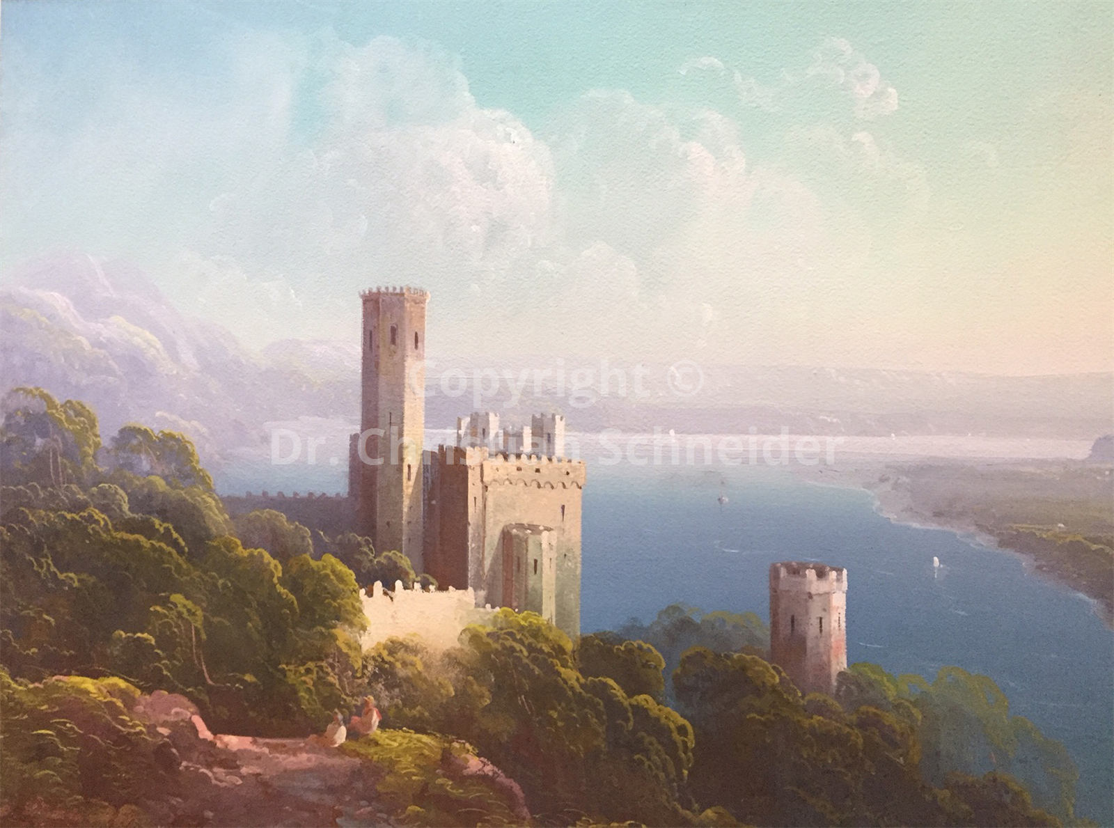 | Motiv/Thema | Stolzenfels am Rhein in romantischer Darstellung mit Figuren |