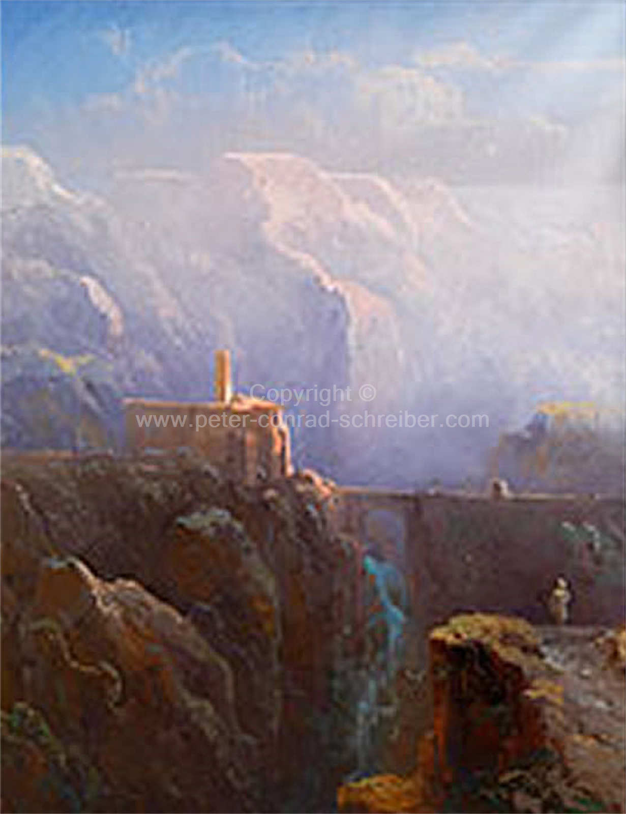 | Motiv/Thema | Italienische Gebirgslandschaft mit Gebäuden und einer Brücke über eine Wasserfallschlucht |