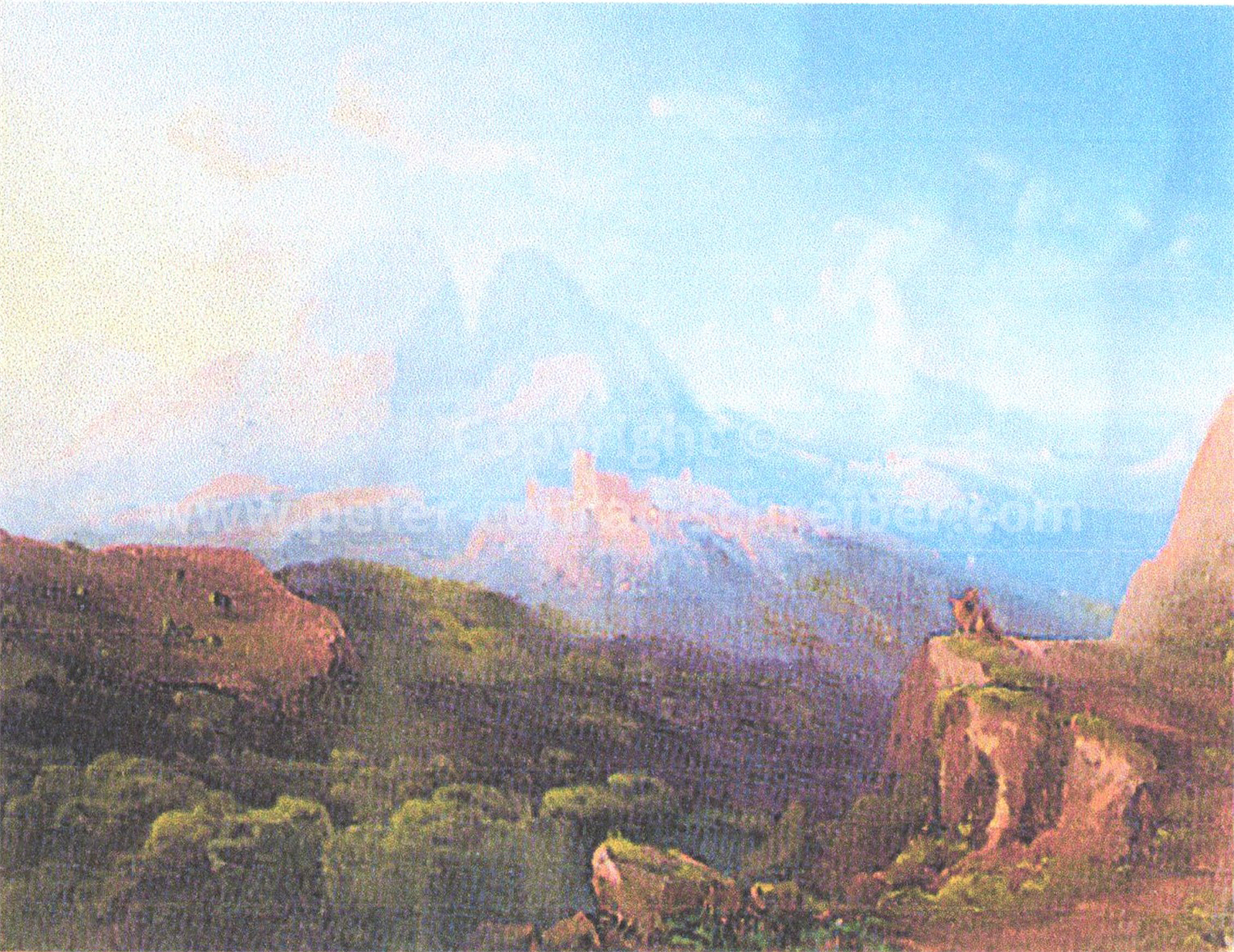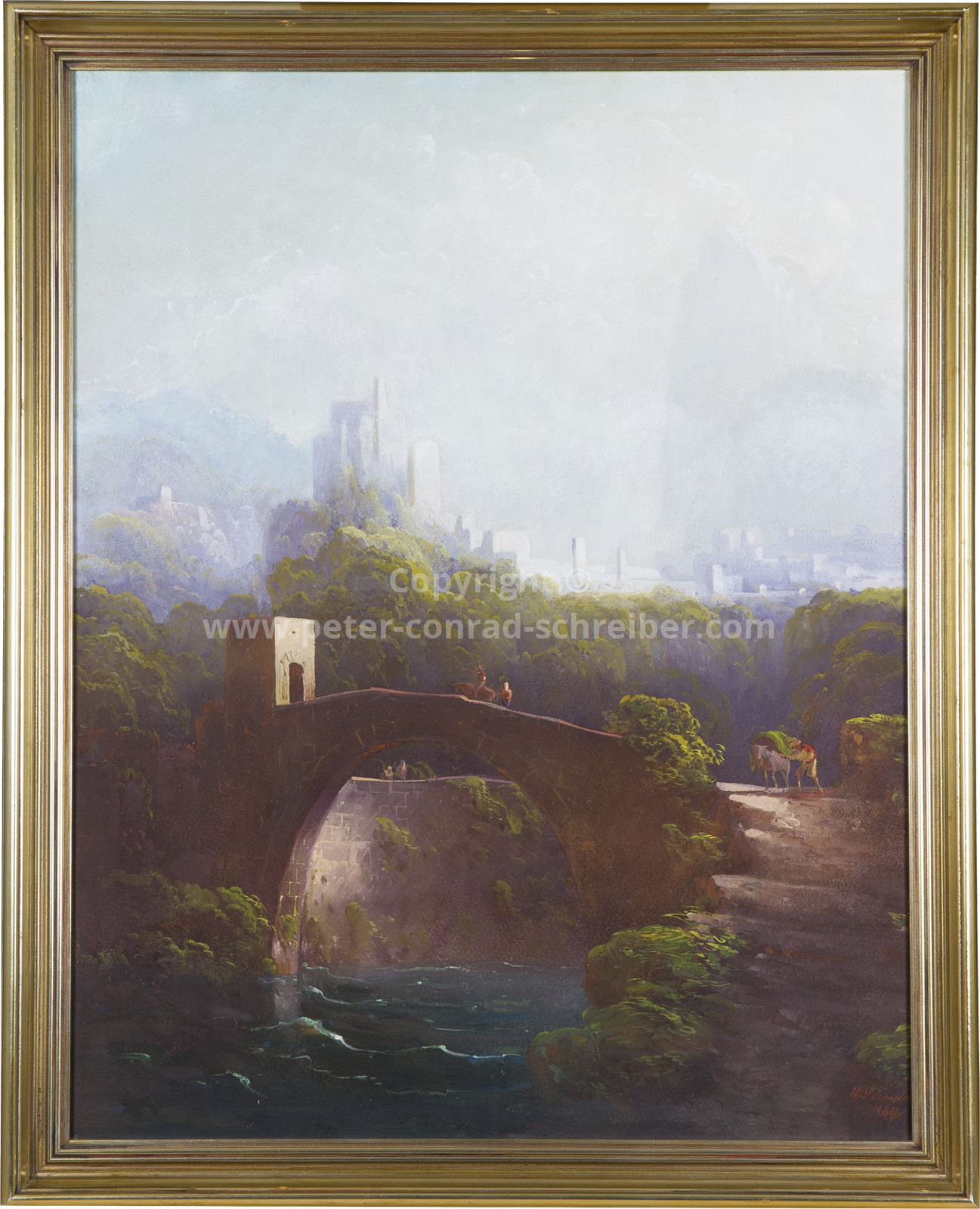 | Beschreibung | Vorne links ein Reiter, weiterer Blick fällt auf eine Brücke über den Tiber. Im Hintergrund verschneite Berglandschaft. Ähnliches Motiv, siehe ID 332 |